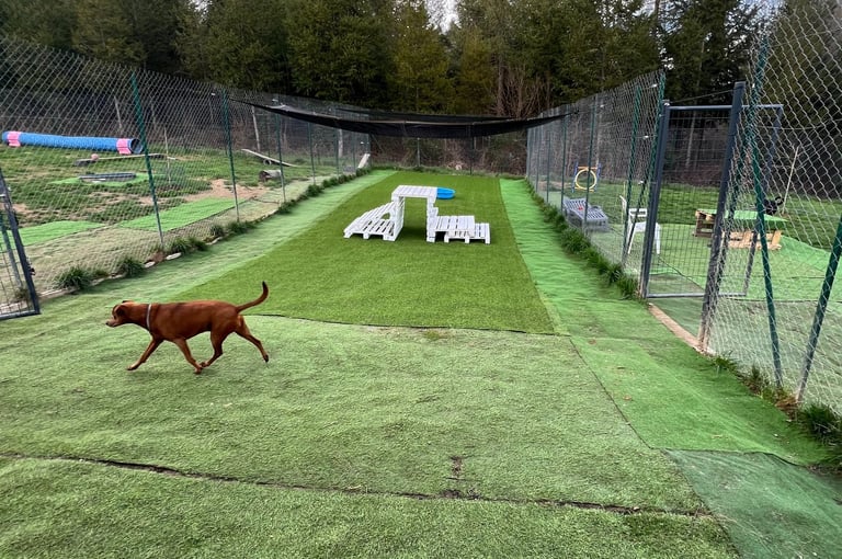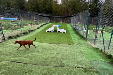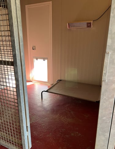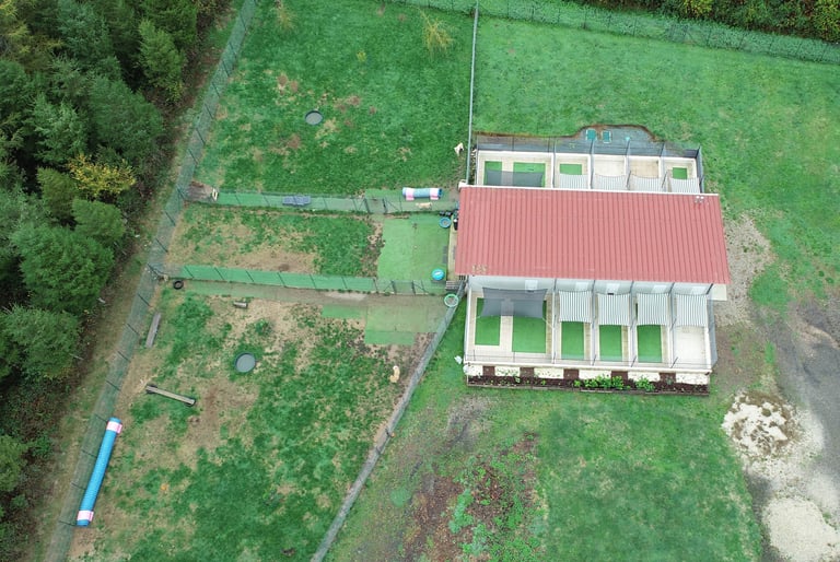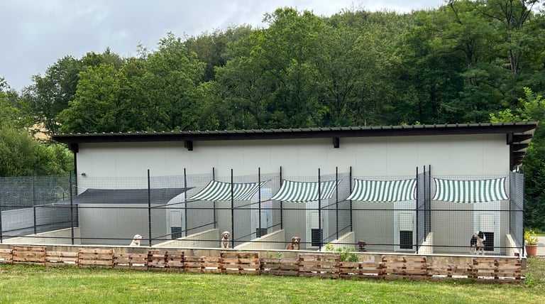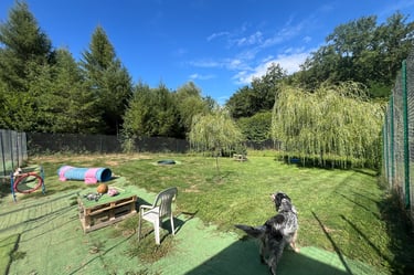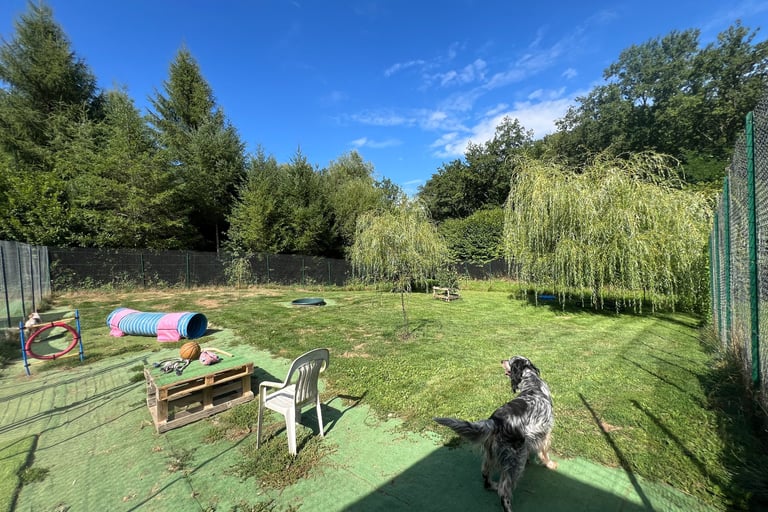 🏡 HÉBERGEMENT PREMIUM Chaque chien dispose de son espace individuel avec lit surélevé, courette privative de 12 m² minimum, musique douce et confort thermique optimal (chauffage infrarouge l'hiver, ventilation l'été). Hygiène irréprochable garantie.
