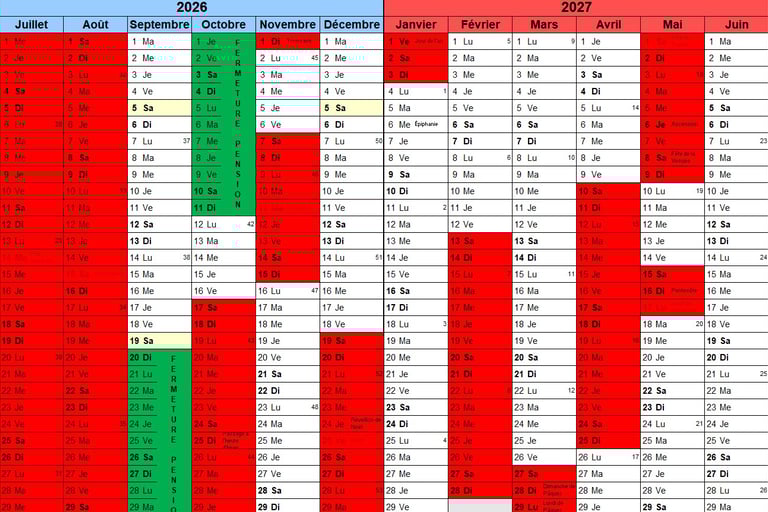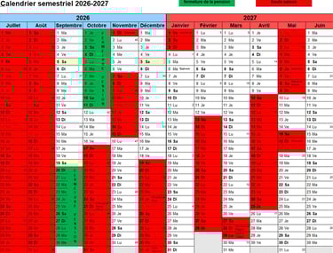 Haute saison (vacances scolaires zone A + ponts) en rouge